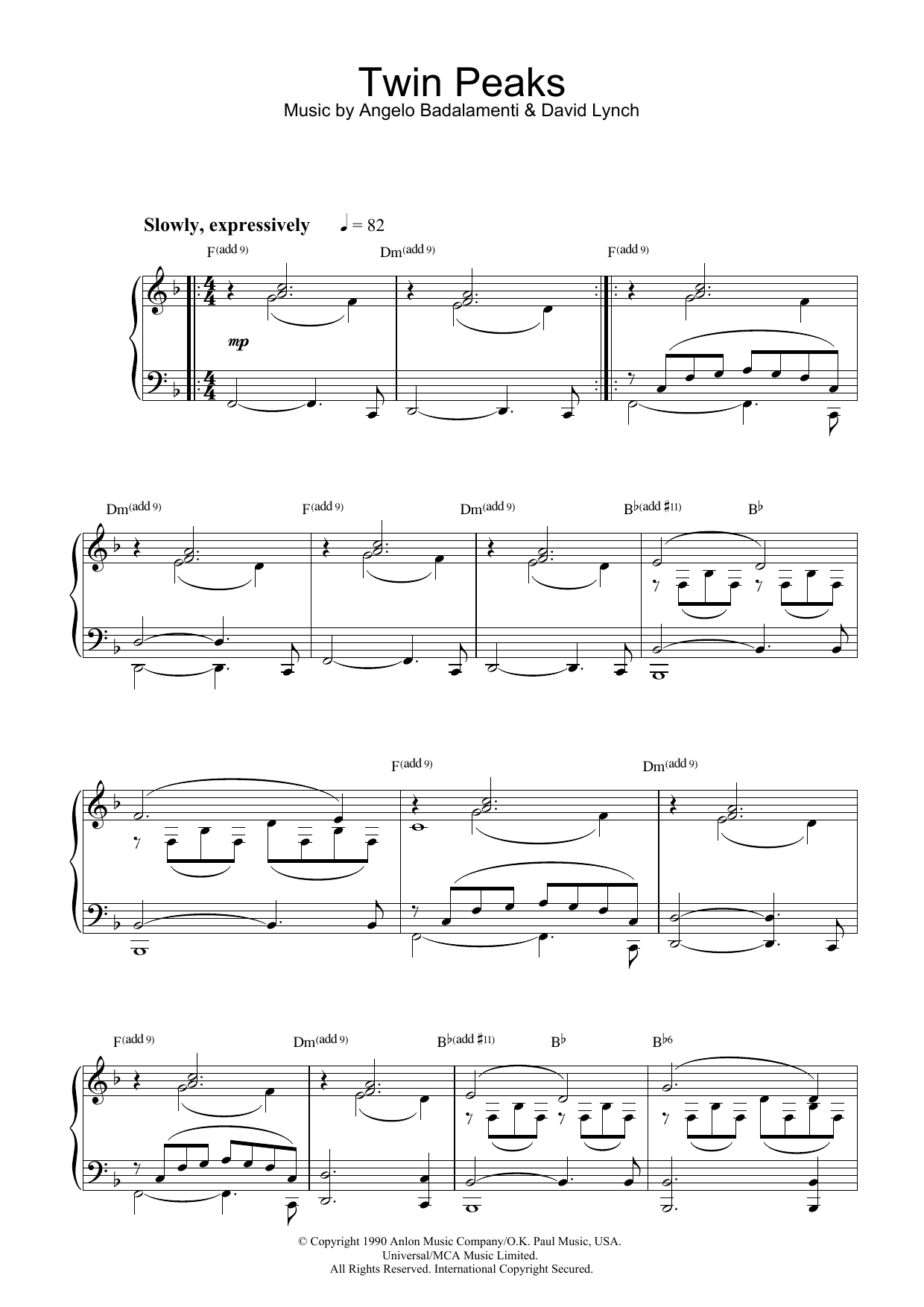 Download or print David Lynch Theme from Twin Peaks sheet music, chords and digital score arranged for Piano Solo. This Film/TV score includes 3 page(s).