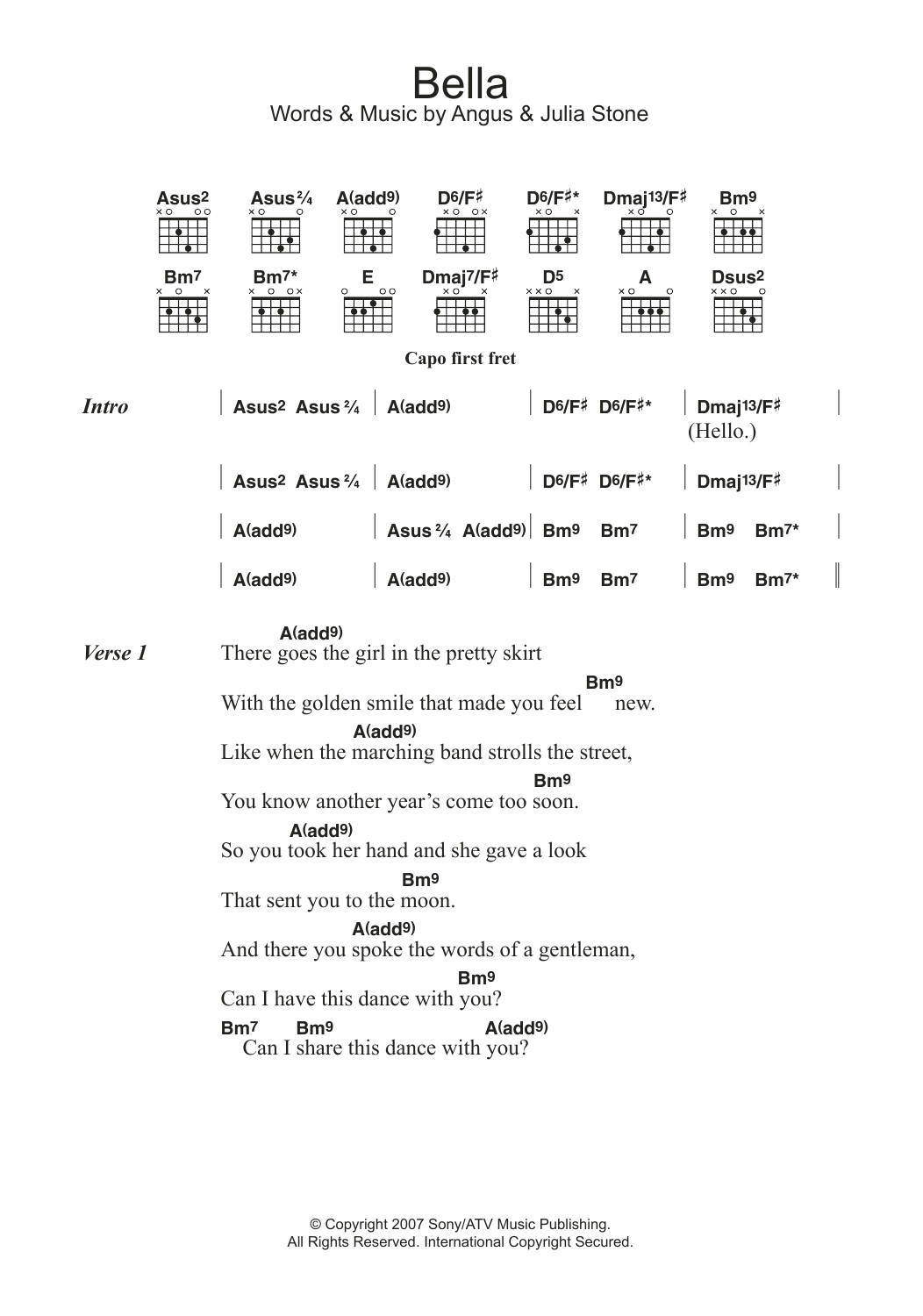 Download or print Angus & Julia Stone Bella sheet music, chords and digital score arranged for Guitar Chords/Lyrics. This Folk score includes 3 page(s).