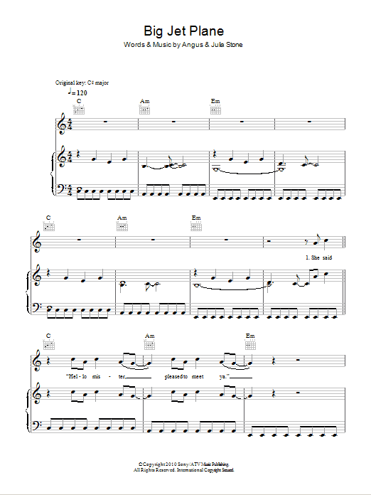 Download or print Angus & Julia Stone Big Jet Plane sheet music, chords and digital score arranged for Lead Sheet / Fake Book. This Pop score includes 3 page(s).