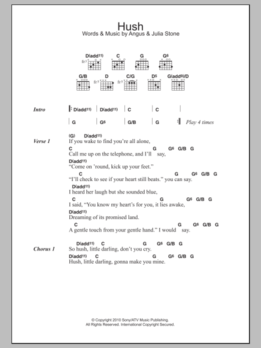 Download or print Angus & Julia Stone Hush sheet music, chords and digital score arranged for Guitar Chords/Lyrics. This Folk score includes 2 page(s).