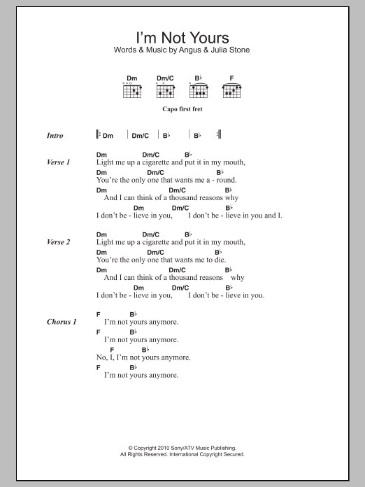 Download or print Angus & Julia Stone I'm Not Yours sheet music, chords and digital score arranged for Guitar Chords/Lyrics. This Folk score includes 2 page(s).