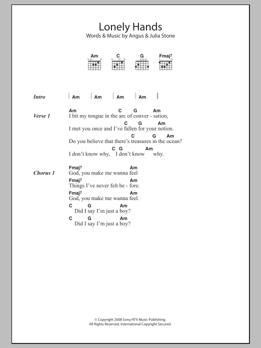 Download or print Angus & Julia Stone Lonely Hands sheet music, chords and digital score arranged for Guitar Chords/Lyrics. This Folk score includes 2 page(s).