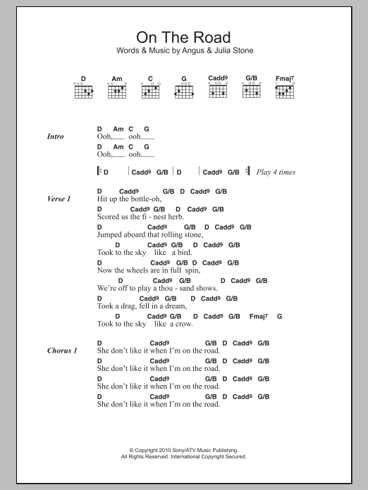 Download or print Angus & Julia Stone On The Road sheet music, chords and digital score arranged for Guitar Chords/Lyrics. This Folk score includes 2 page(s).