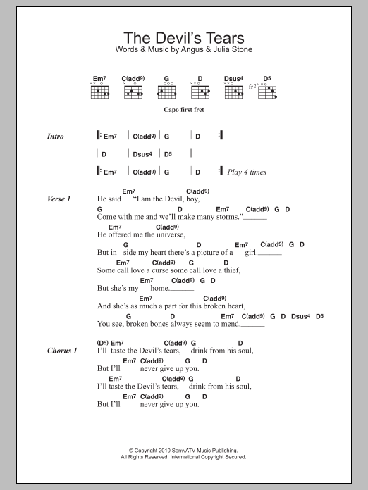 Download or print Angus & Julia Stone The Devil's Tears sheet music, chords and digital score arranged for Guitar Chords/Lyrics. This Folk score includes 2 page(s).