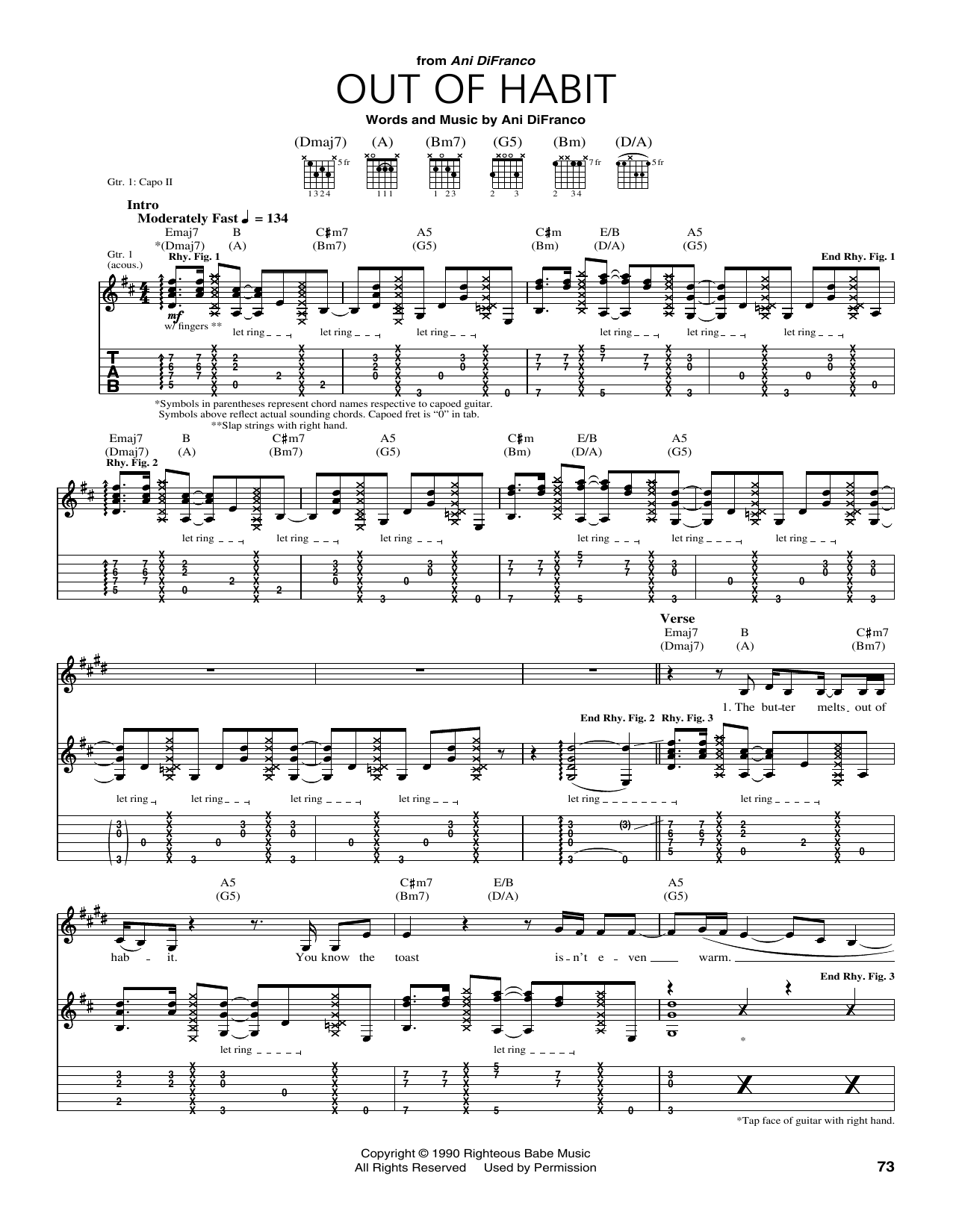 Download or print Ani DiFranco Out Of Habit sheet music, chords and digital score arranged for Guitar Tab. This Pop score includes 4 page(s).