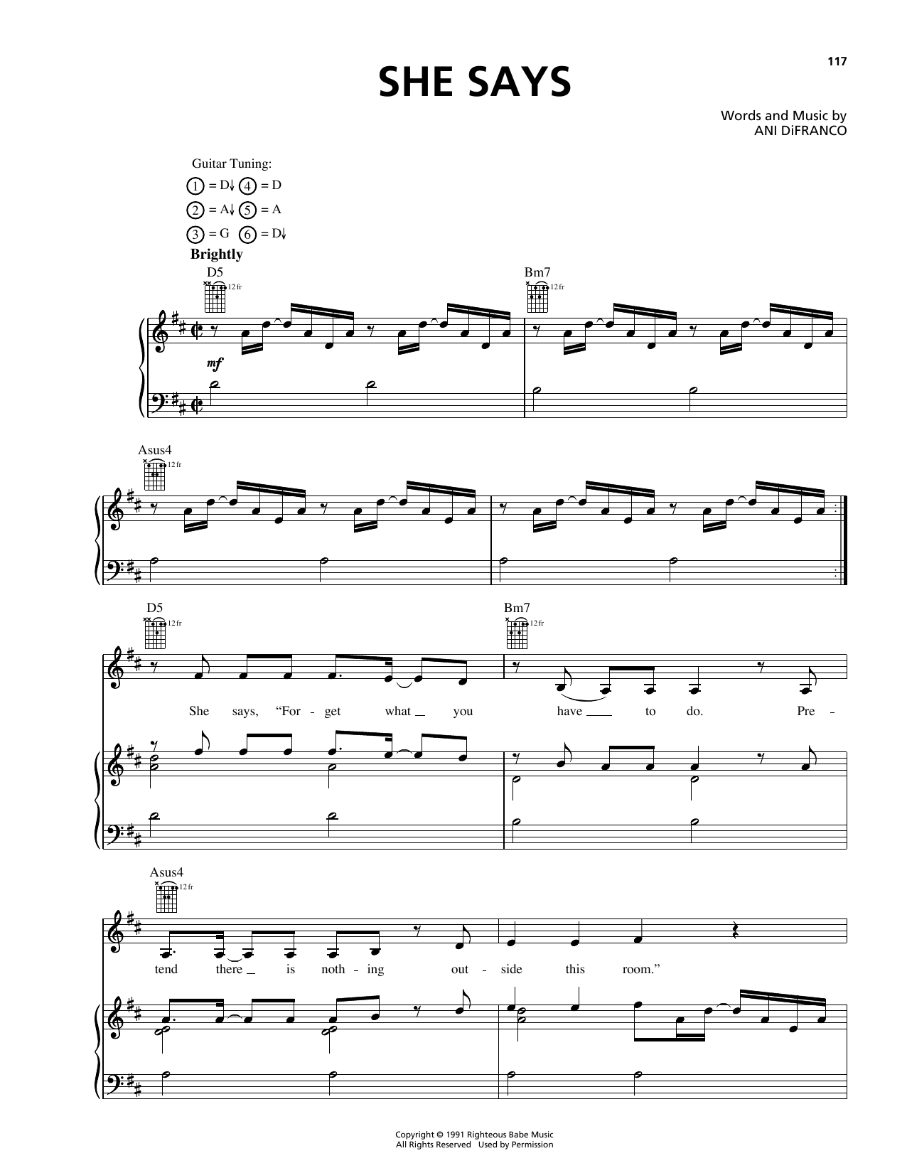 Download or print Ani DiFranco She Says sheet music, chords and digital score arranged for Piano, Vocal & Guitar Chords (Right-Hand Melody). This Pop score includes 10 page(s).