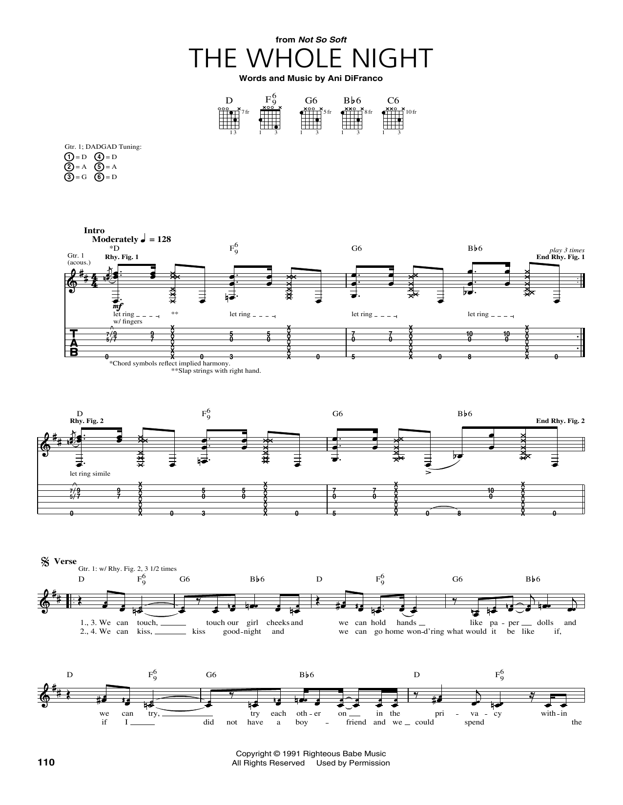 Download or print Ani DiFranco The Whole Night sheet music, chords and digital score arranged for Guitar Tab. This Pop score includes 3 page(s).