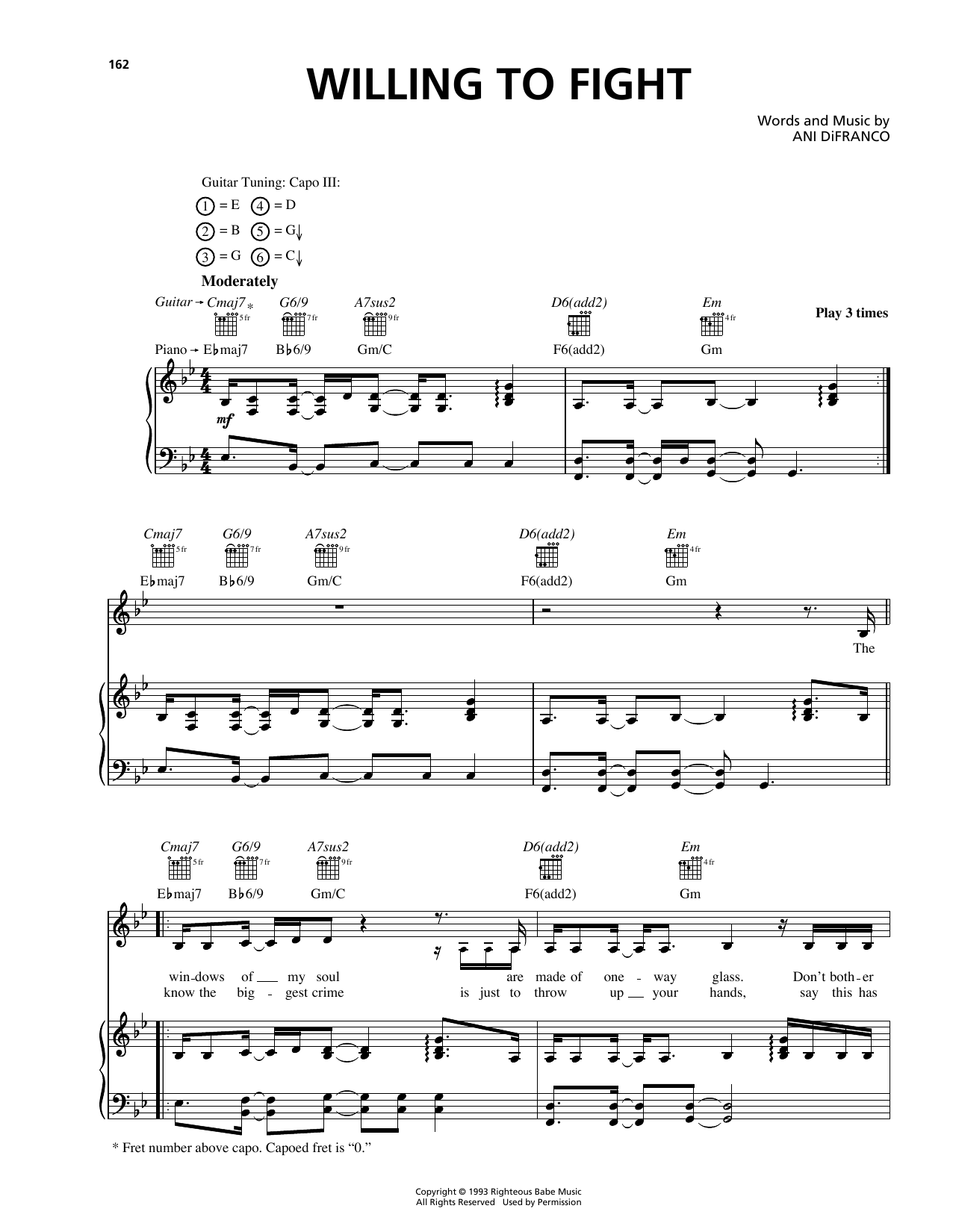 Download or print Ani DiFranco Willing To Fight sheet music, chords and digital score arranged for Piano, Vocal & Guitar Chords (Right-Hand Melody). This Pop score includes 7 page(s).