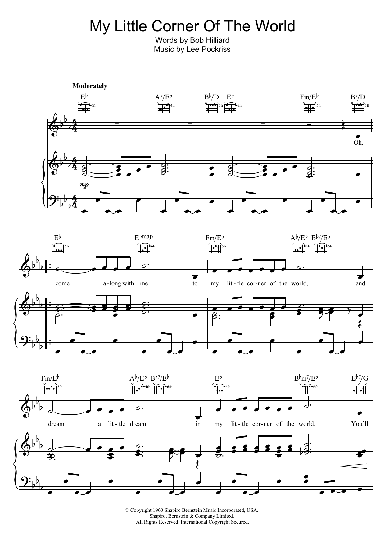Download or print Anita Bryant My Little Corner Of The World sheet music, chords and digital score arranged for Piano, Vocal & Guitar Chords. This Standards score includes 3 page(s).