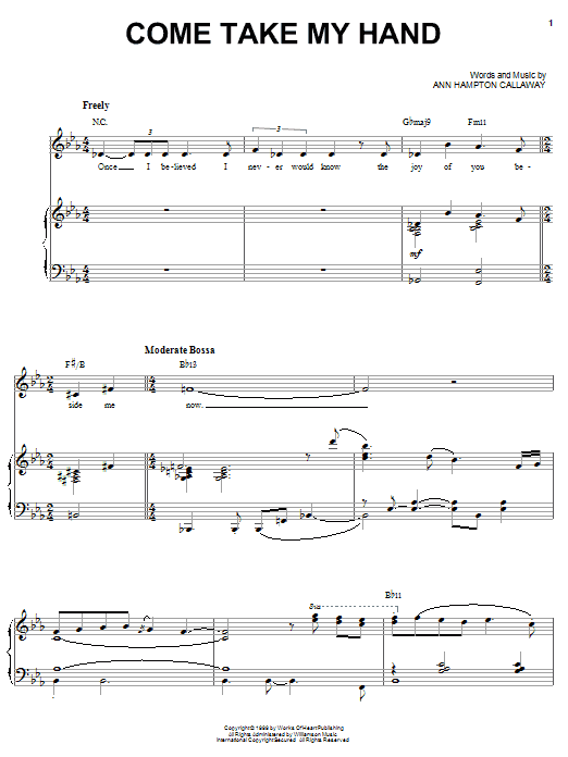 Download or print Ann Hampton Callaway Come Take My Hand sheet music, chords and digital score arranged for Piano & Vocal. This Jazz score includes 6 page(s).