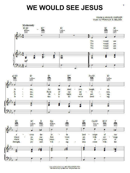Download or print Anna B. Warner We Would See Jesus sheet music, chords and digital score arranged for Easy Piano. This Christian score includes 2 page(s).