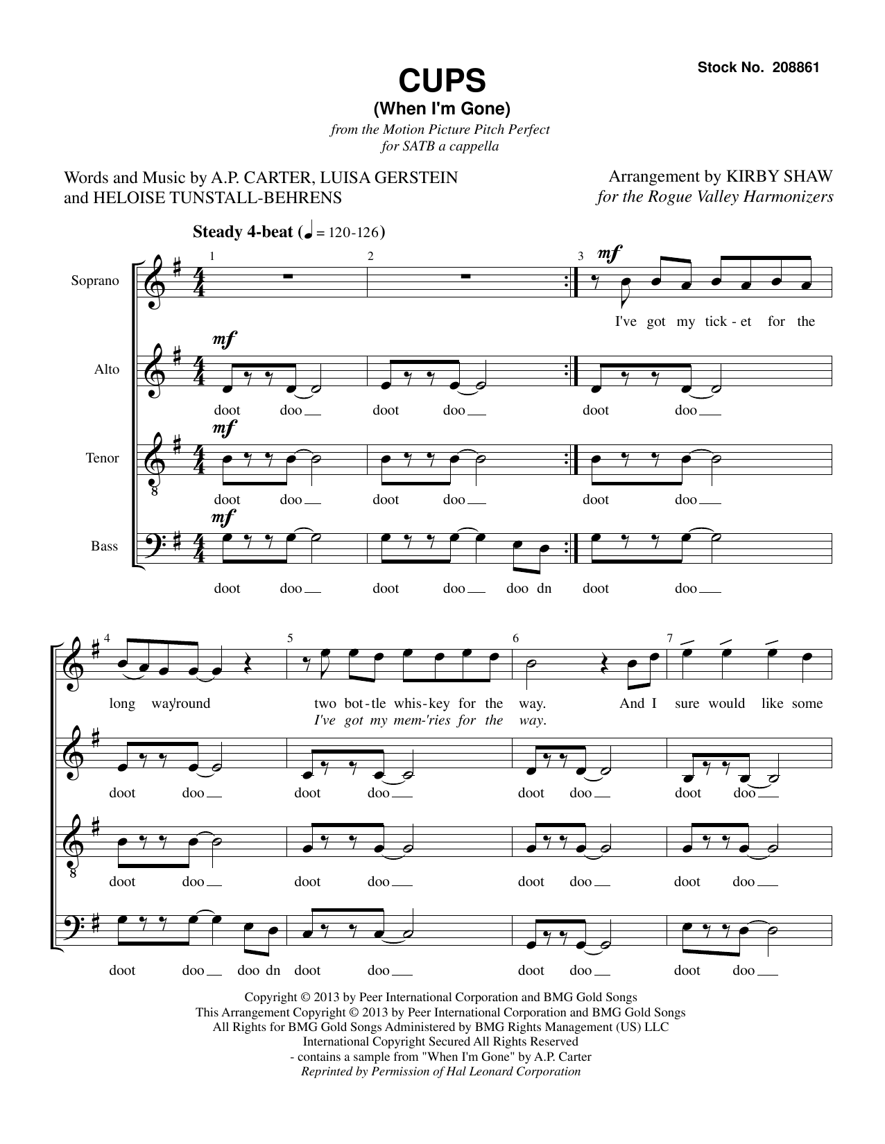 Download or print Anna Kendrick Cups (When I'm Gone) (from Pitch Perfect) (arr. Kirby Shaw) sheet music, chords and digital score arranged for SSAA Choir. This Barbershop score includes 12 page(s).