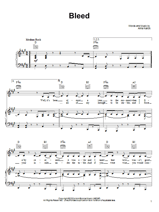 Download or print Anna Nalick Bleed sheet music, chords and digital score arranged for Piano, Vocal & Guitar Chords (Right-Hand Melody). This Pop score includes 6 page(s).