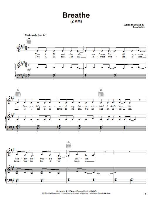 Download or print Anna Nalick Breathe (2 AM) sheet music, chords and digital score arranged for Piano, Vocal & Guitar Chords (Right-Hand Melody). This Pop score includes 7 page(s).