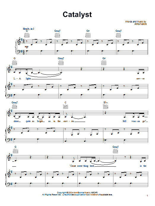 Download or print Anna Nalick Catalyst sheet music, chords and digital score arranged for Piano, Vocal & Guitar Chords (Right-Hand Melody). This Pop score includes 6 page(s).