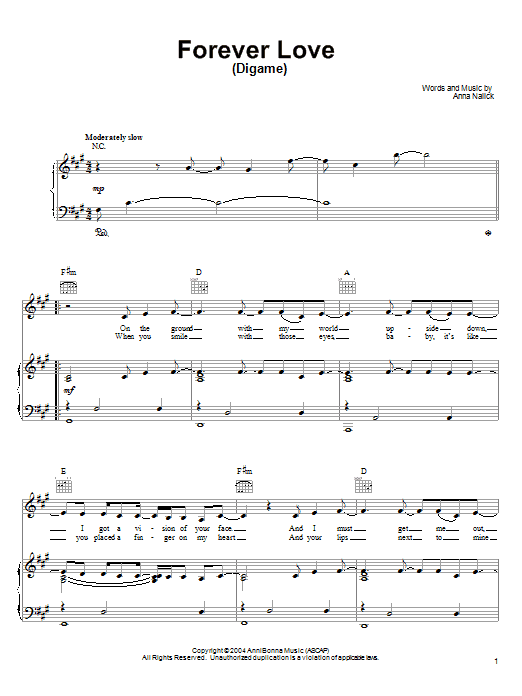 Download or print Anna Nalick Forever Love (Digame) sheet music, chords and digital score arranged for Piano, Vocal & Guitar Chords (Right-Hand Melody). This Pop score includes 3 page(s).