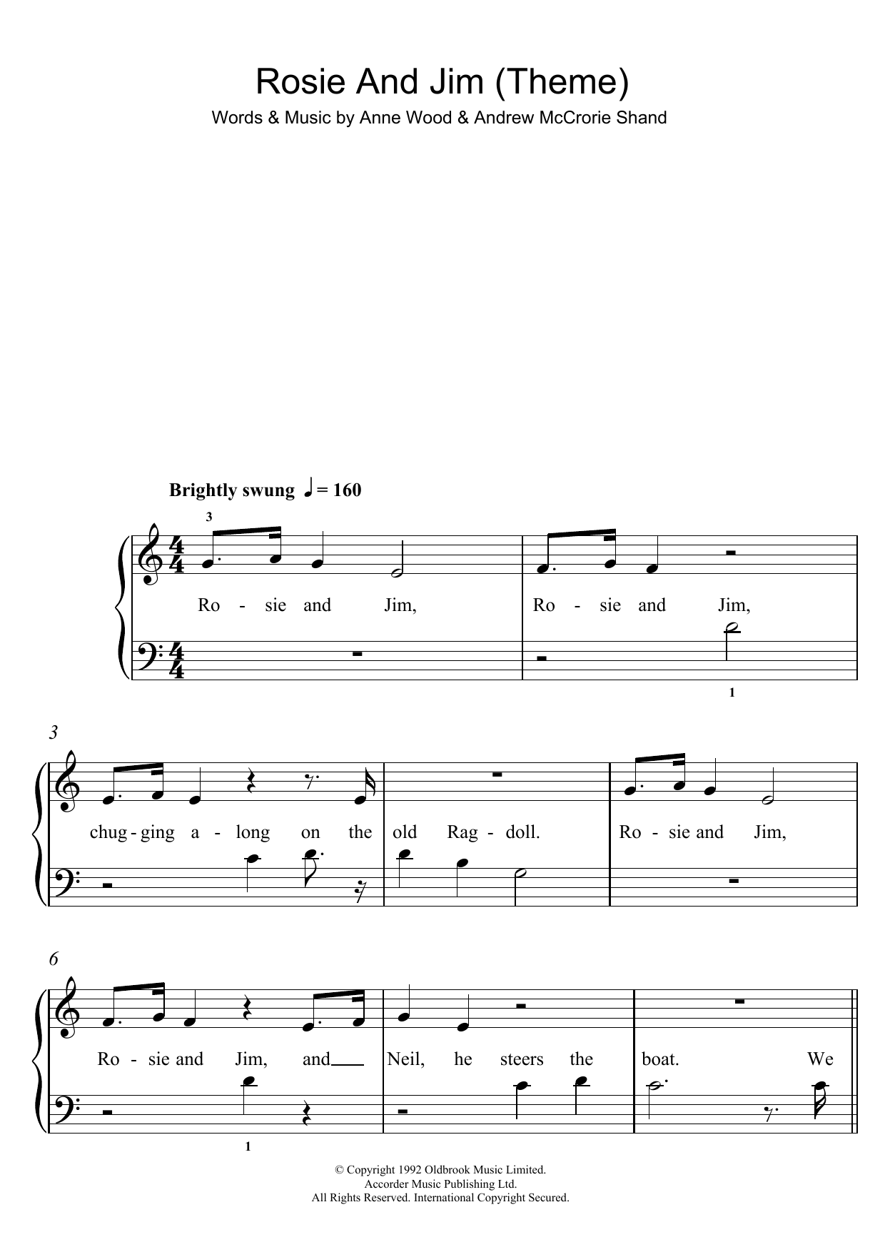 Download or print Anne Wood Rosie And Jim (Theme) sheet music, chords and digital score arranged for 5-Finger Piano. This Children score includes 2 page(s).