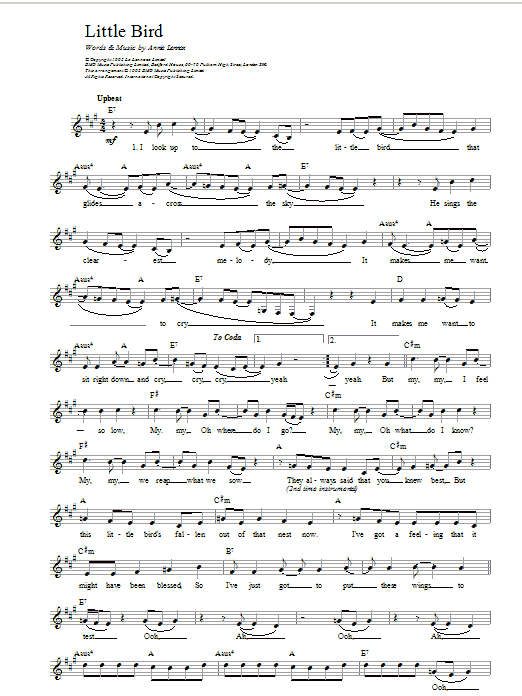 Download or print Annie Lennox Little Bird sheet music, chords and digital score arranged for Lead Sheet / Fake Book. This Pop score includes 2 page(s).