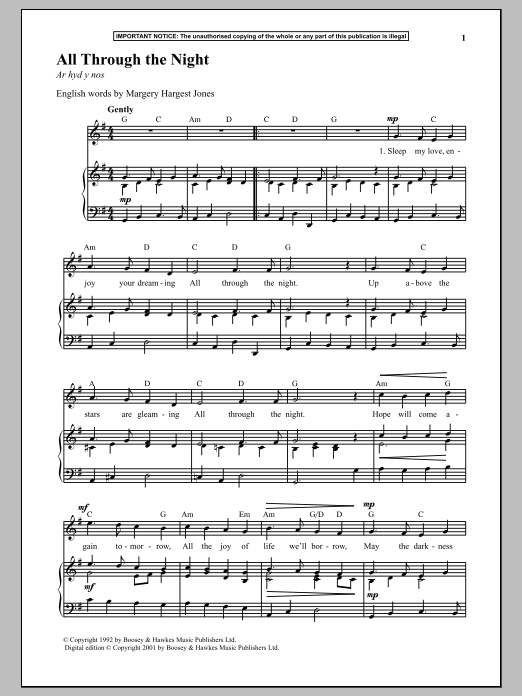 Download or print Anonymous All Through The Night sheet music, chords and digital score arranged for Piano & Vocal. This Traditional score includes 2 page(s).