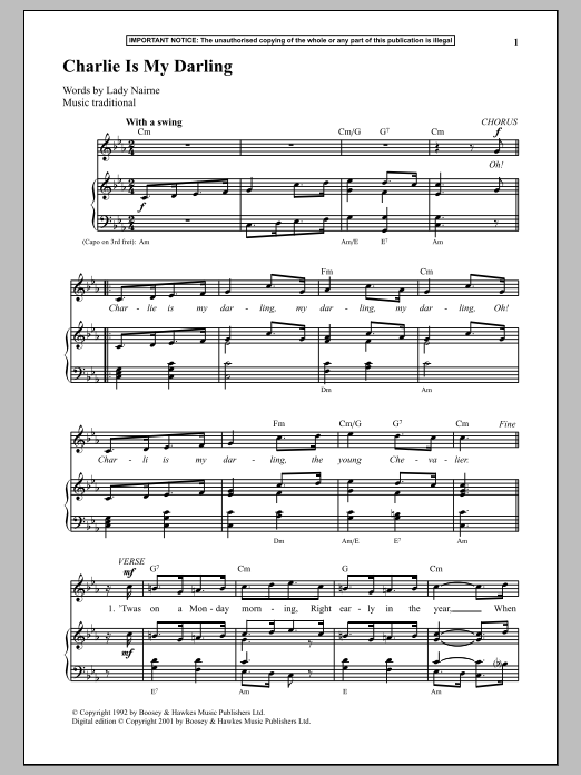 Download or print Anonymous Charlie Is My Darling sheet music, chords and digital score arranged for Piano & Vocal. This Traditional score includes 2 page(s).