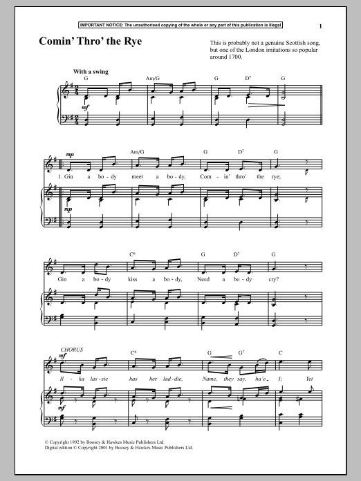 Download or print Anonymous Comin Thro The Rye sheet music, chords and digital score arranged for Piano & Vocal. This Traditional score includes 2 page(s).