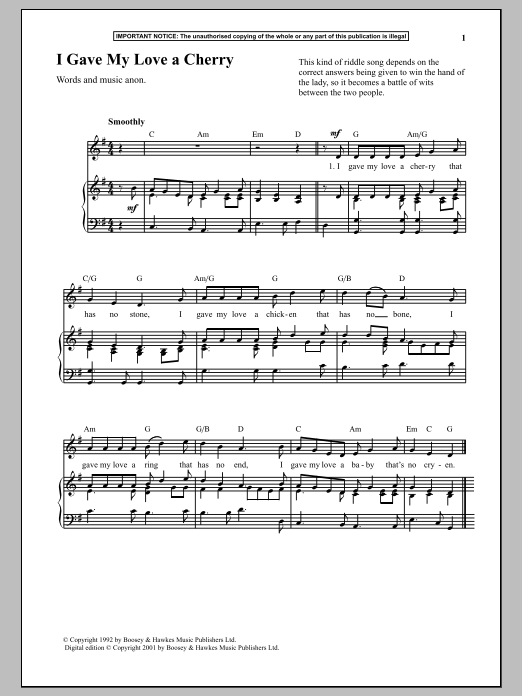 Download or print Anonymous I Gave My Love A Cherry sheet music, chords and digital score arranged for Piano & Vocal. This Traditional score includes 2 page(s).