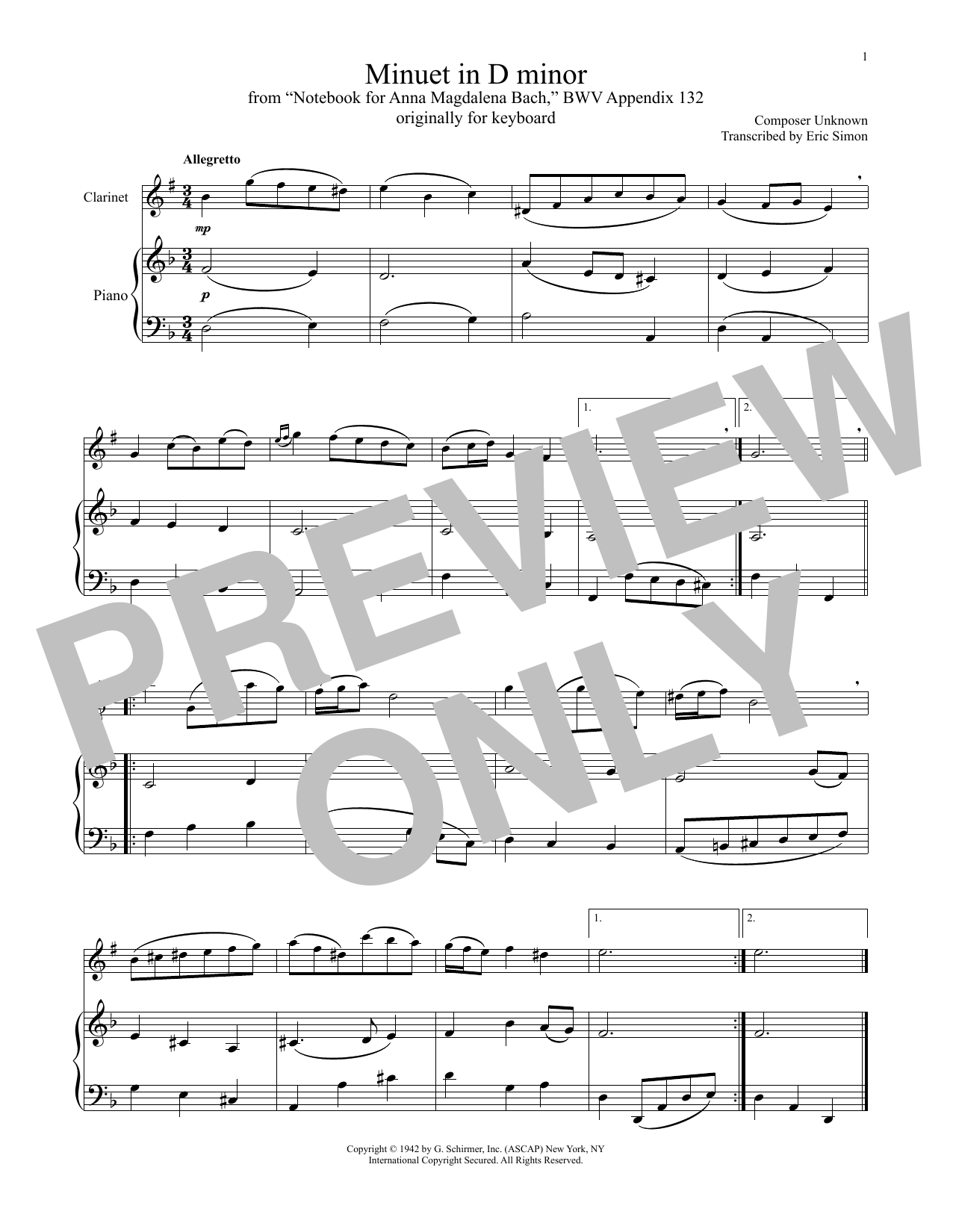 Download or print Anonymous Minuet In D Minor, BWV Appendix 132 sheet music, chords and digital score arranged for Clarinet and Piano. This Classical score includes 1 page(s).
