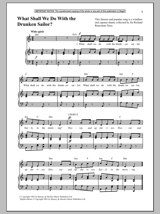 Download or print Anonymous What Shall We Do With The Drunken Sailor? sheet music, chords and digital score arranged for Piano & Vocal. This Traditional score includes 2 page(s).