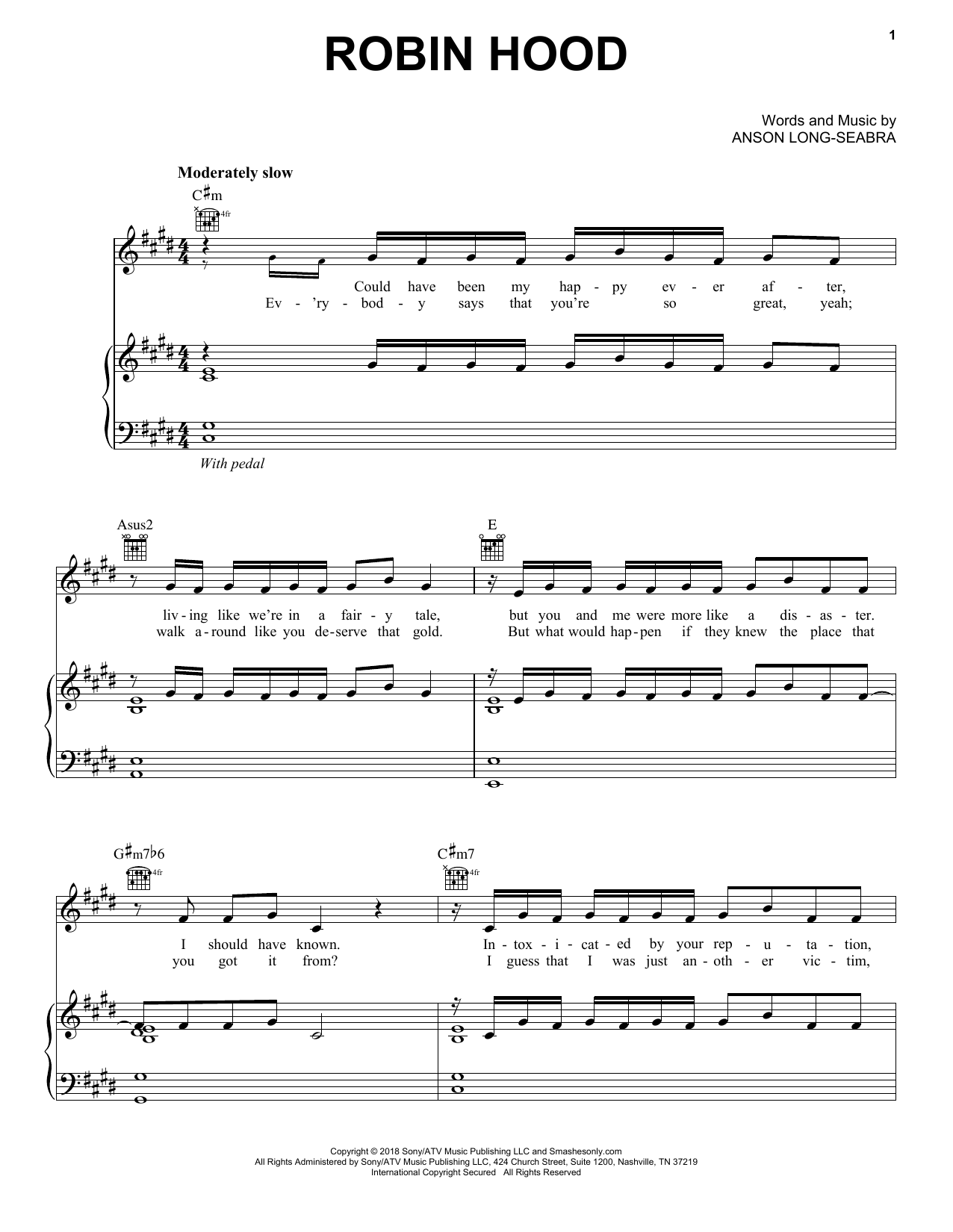 Download or print Anson Seabra Robin Hood sheet music, chords and digital score arranged for Piano, Vocal & Guitar Chords (Right-Hand Melody). This Pop score includes 4 page(s).