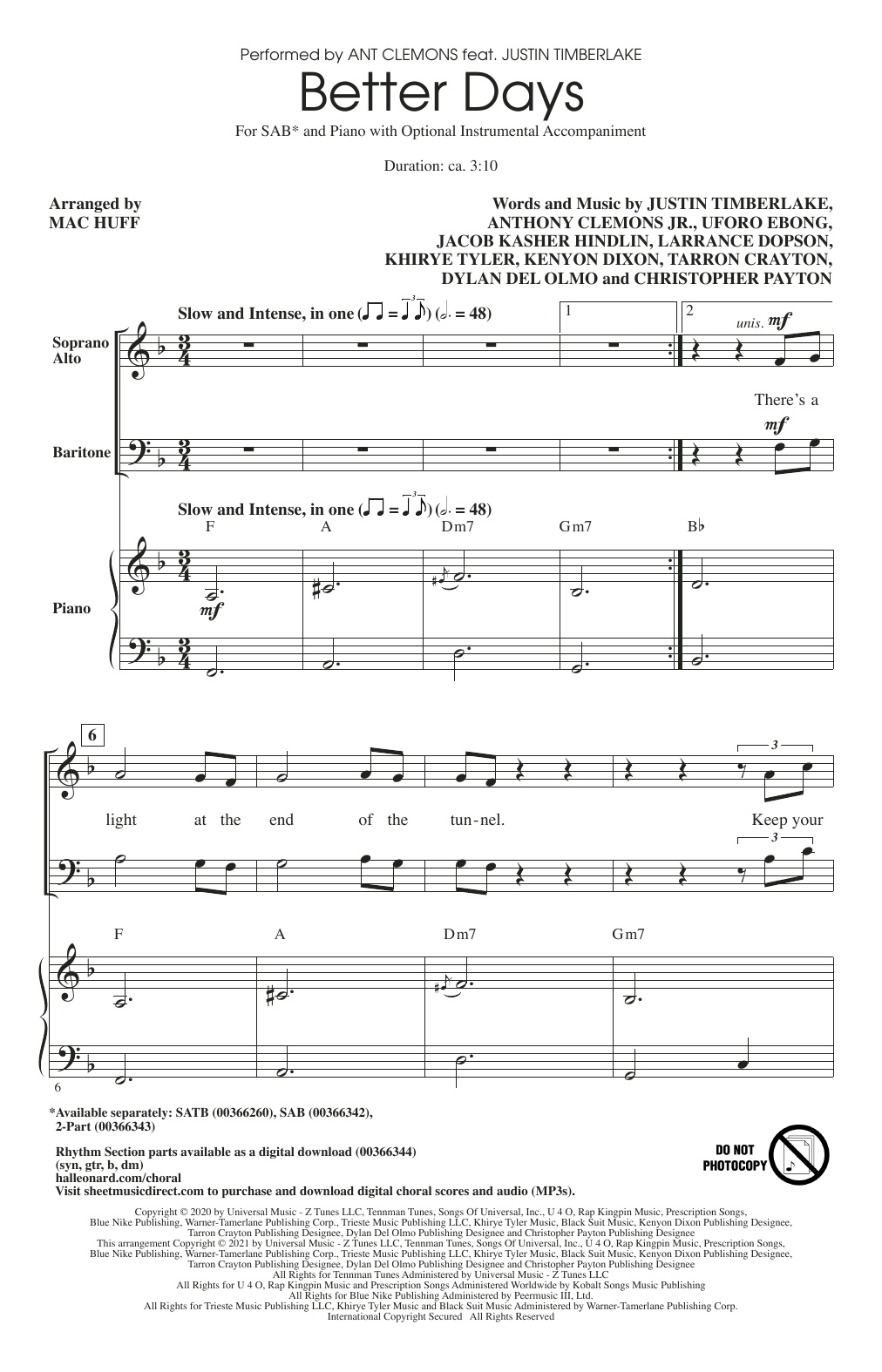 Download or print Ant Clemons feat. Justin Timberlake Better Days (arr. Mac Huff) sheet music, chords and digital score arranged for SAB Choir. This Patriotic score includes 13 page(s).