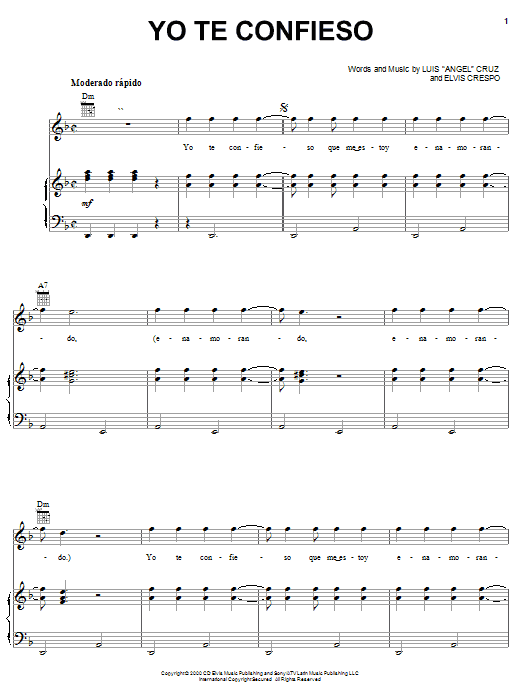 Download or print Anthony Yo Te Confieso sheet music, chords and digital score arranged for Piano, Vocal & Guitar Chords (Right-Hand Melody). This Latin score includes 6 page(s).