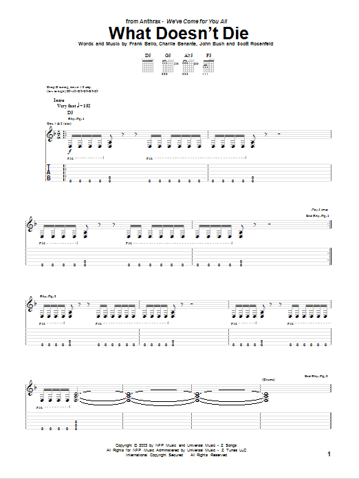 Download or print Anthrax What Doesn't Die sheet music, chords and digital score arranged for Guitar Tab. This Metal score includes 12 page(s).