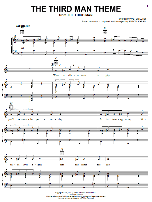 Download or print Anton Karas The Third Man Theme sheet music, chords and digital score arranged for Piano, Vocal & Guitar Chords (Right-Hand Melody). This Country score includes 6 page(s).