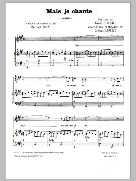 Download or print Antonio Bernai Mais Je Chante (Saudade) sheet music, chords and digital score arranged for Piano & Vocal. This Pop score includes 3 page(s).