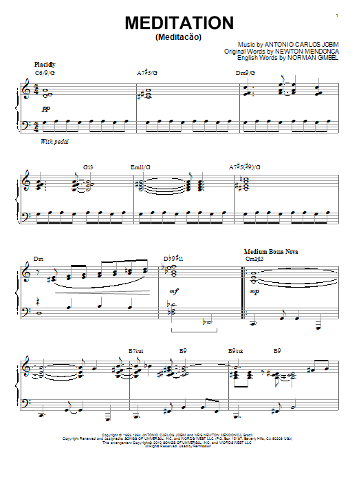 Download or print Antonio Carlos Jobim Meditation (Meditacao) [Jazz version] (arr. Brent Edstrom) sheet music, chords and digital score arranged for Piano & Vocal. This Jazz score includes 3 page(s).