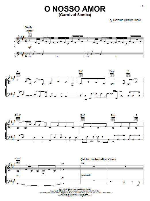 Download or print Antonio Carlos Jobim O Nosso Amor (Carnaval Samba) sheet music, chords and digital score arranged for Piano, Vocal & Guitar Chords (Right-Hand Melody). This Jazz score includes 5 page(s).