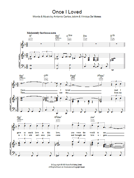 Download or print Antonio Carlos Jobim Once I Loved sheet music, chords and digital score arranged for Piano, Vocal & Guitar Chords. This Jazz score includes 3 page(s).