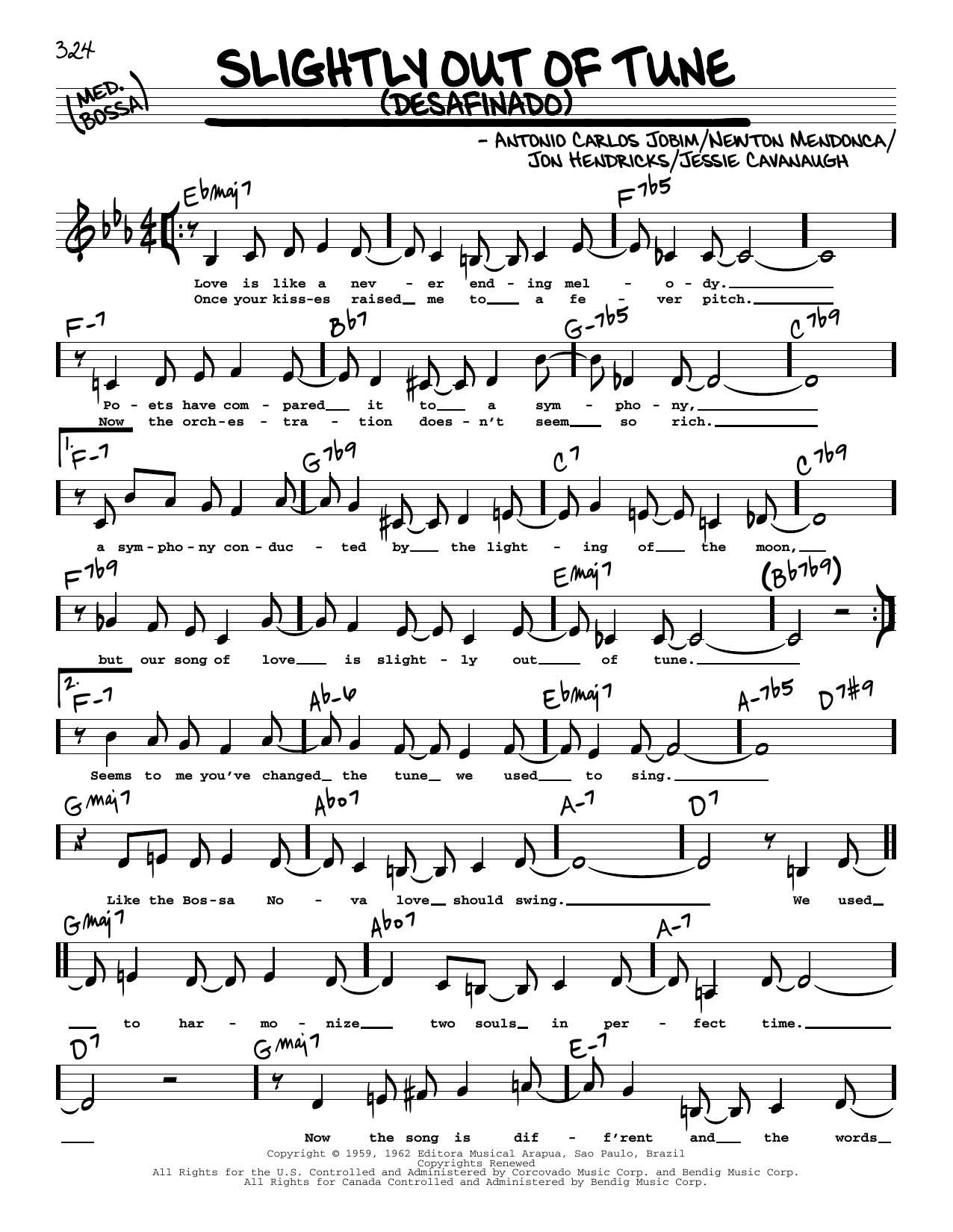 Download or print Antonio Carlos Jobim Slightly Out Of Tune (Desafinado) (Low Voice) sheet music, chords and digital score arranged for Real Book – Melody, Lyrics & Chords. This Jazz score includes 2 page(s).