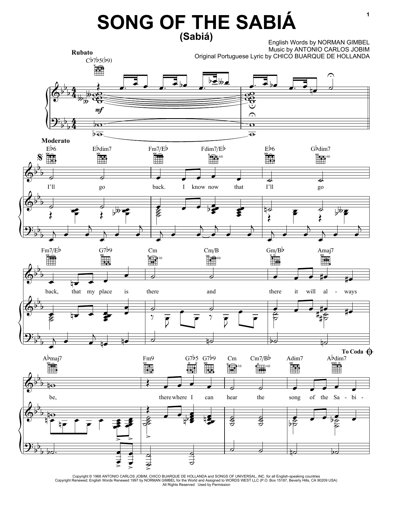 Download or print Antonio Carlos Jobim Song Of The Sabia (Sabia) sheet music, chords and digital score arranged for Easy Piano. This Jazz score includes 4 page(s).