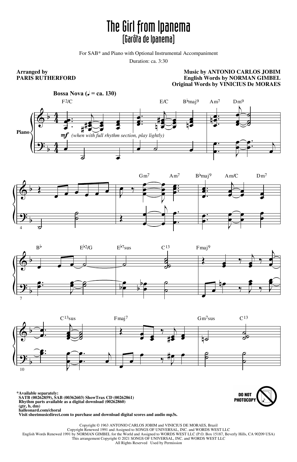 Download or print Antonio Carlos Jobim The Girl from Ipanema (Garôta de Ipanema) (arr. Paris Rutherford) sheet music, chords and digital score arranged for SAB Choir. This Jazz score includes 13 page(s).