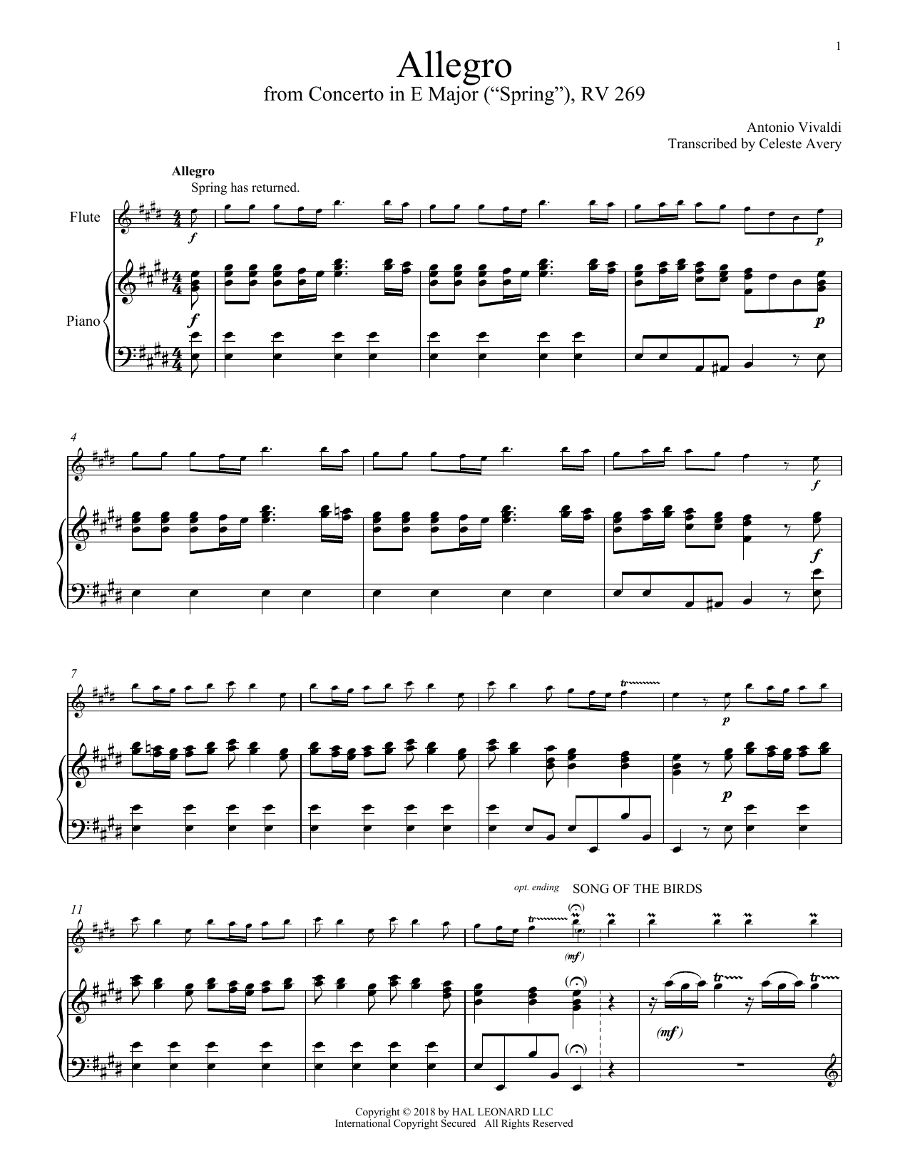 Download or print Antonio Vivaldi Allegro I, RV 269 ("Spring") sheet music, chords and digital score arranged for Piano Solo. This Classical score includes 5 page(s).