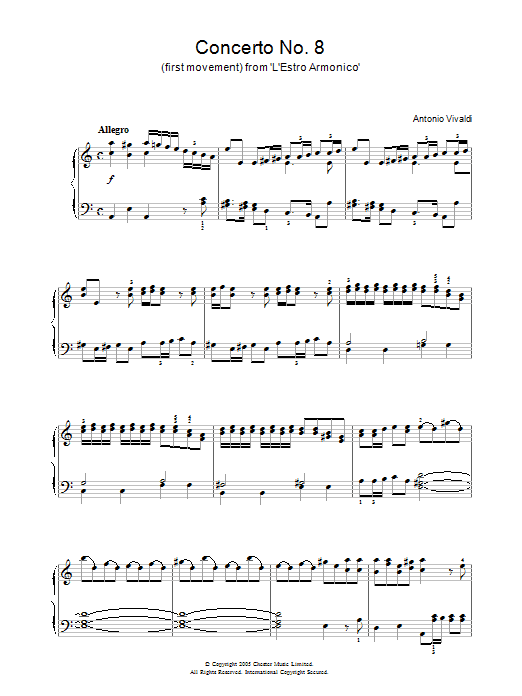 Download or print Antonio Vivaldi Allegro) from 'L'Estro Armonico' Op.3 sheet music, chords and digital score arranged for Piano Solo. This Classical score includes 4 page(s).