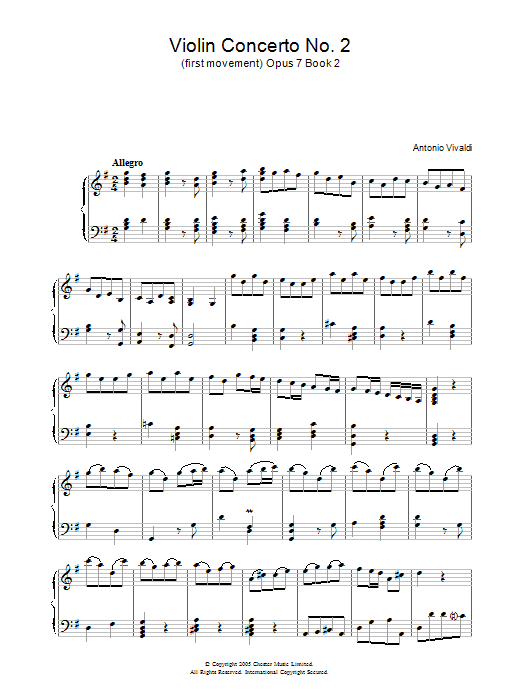 Download or print Antonio Vivaldi Allegro Op.7, Book 2 sheet music, chords and digital score arranged for Piano Solo. This Classical score includes 4 page(s).