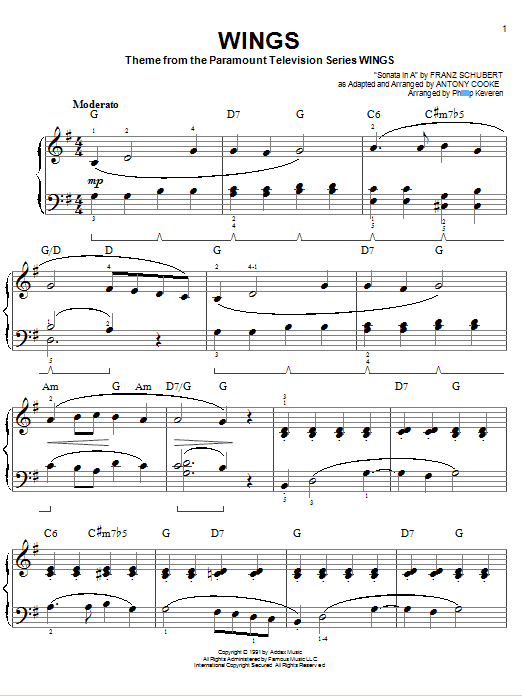 Download or print Antony Cooke Wings (arr. Phillip Keveren) sheet music, chords and digital score arranged for Easy Piano. This Film/TV score includes 2 page(s).