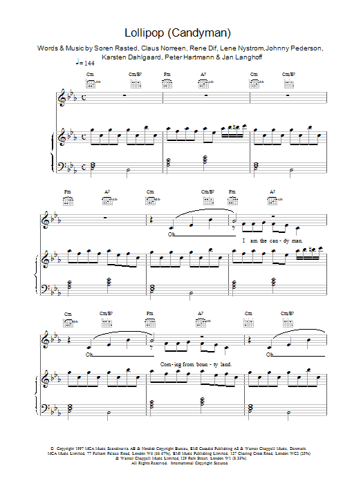 Download or print Aqua Lollipop (Candyman) sheet music, chords and digital score arranged for Piano, Vocal & Guitar Chords. This Pop score includes 7 page(s).