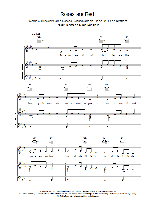 Download or print Aqua Roses Are Red sheet music, chords and digital score arranged for Piano, Vocal & Guitar Chords (Right-Hand Melody). This Pop score includes 7 page(s).