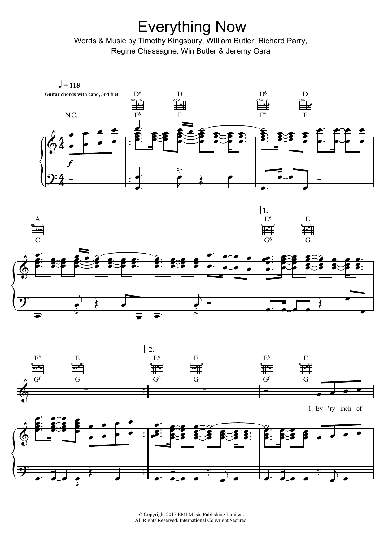 Download or print Arcade Fire Everything Now sheet music, chords and digital score arranged for Piano, Vocal & Guitar Chords. This Pop score includes 13 page(s).