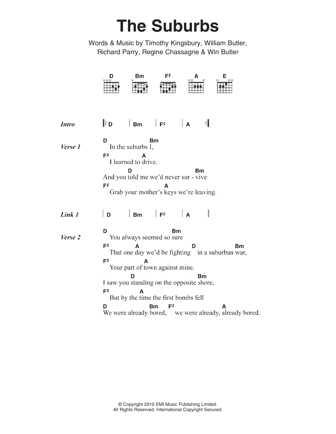 Download or print Arcade Fire The Suburbs sheet music, chords and digital score arranged for Guitar Chords/Lyrics. This Pop score includes 3 page(s).