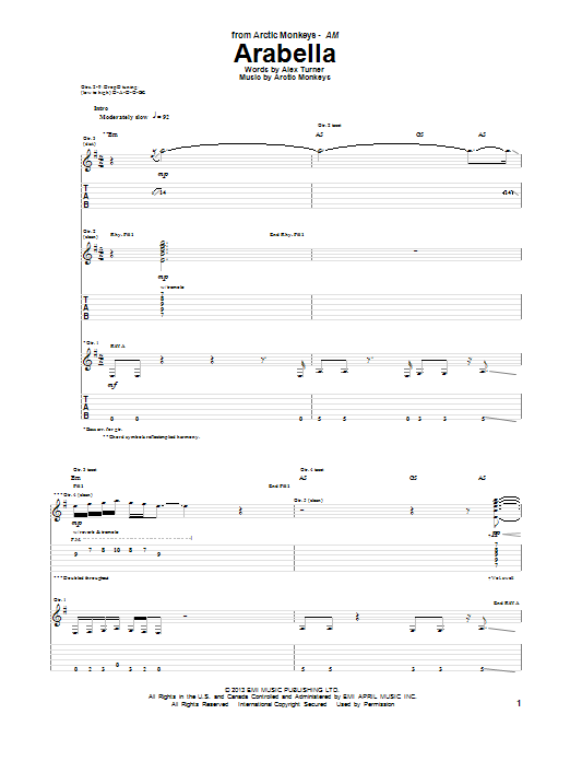 Download or print Arctic Monkeys Arabella sheet music, chords and digital score arranged for Guitar Tab. This Pop score includes 8 page(s).