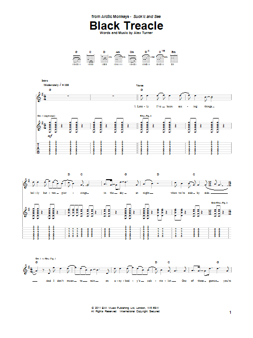 Download or print Arctic Monkeys Black Treacle sheet music, chords and digital score arranged for Guitar Tab. This Alternative score includes 6 page(s).